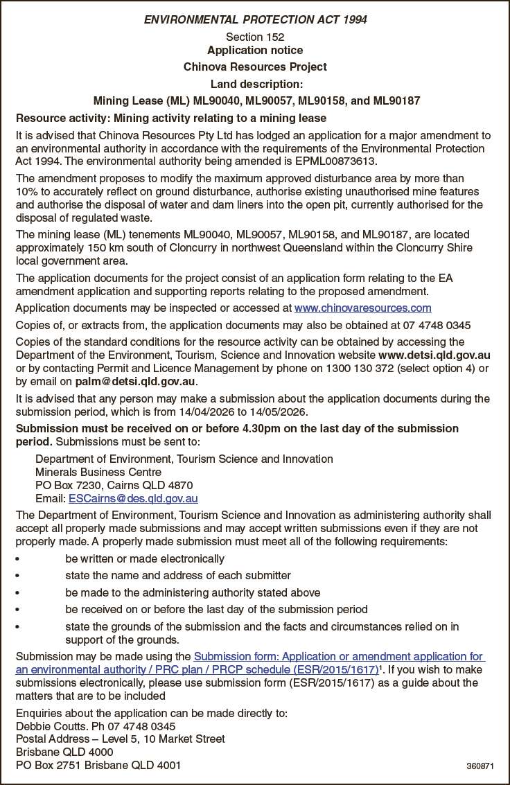 It is advised that Chinova Resources Pty Ltd has lodged an application for a major amendment to an environmental authority in accordance with the requirements of the Environmental Protection Act 1994. The environmental authority being amended is EPML00873613.